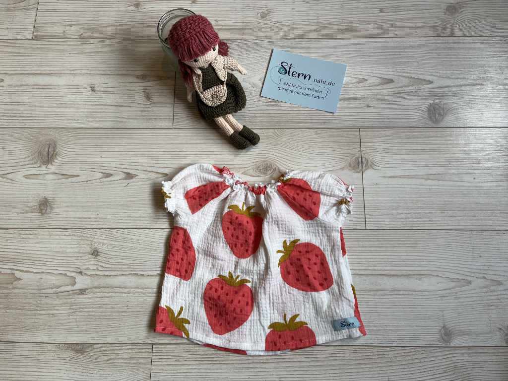 Bald ist wieder Erdbeerzeit. Diese luftige Erdbeerbluse für Babys passt gut zum warmen Wetter. Aus Stoffresten ist diese Musselin-Bluse entstanden. Zuvor habe ich aus dem Stoff eine Kinderbluse genäht.