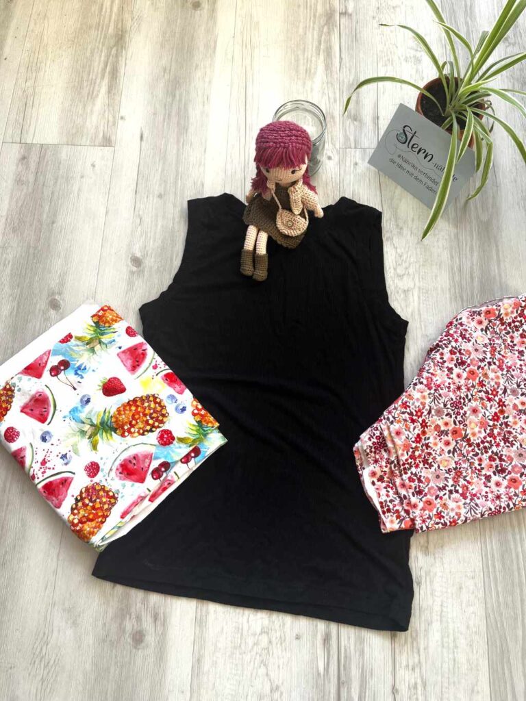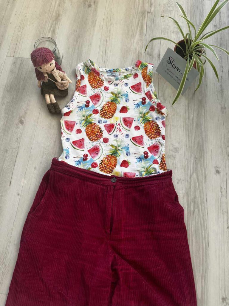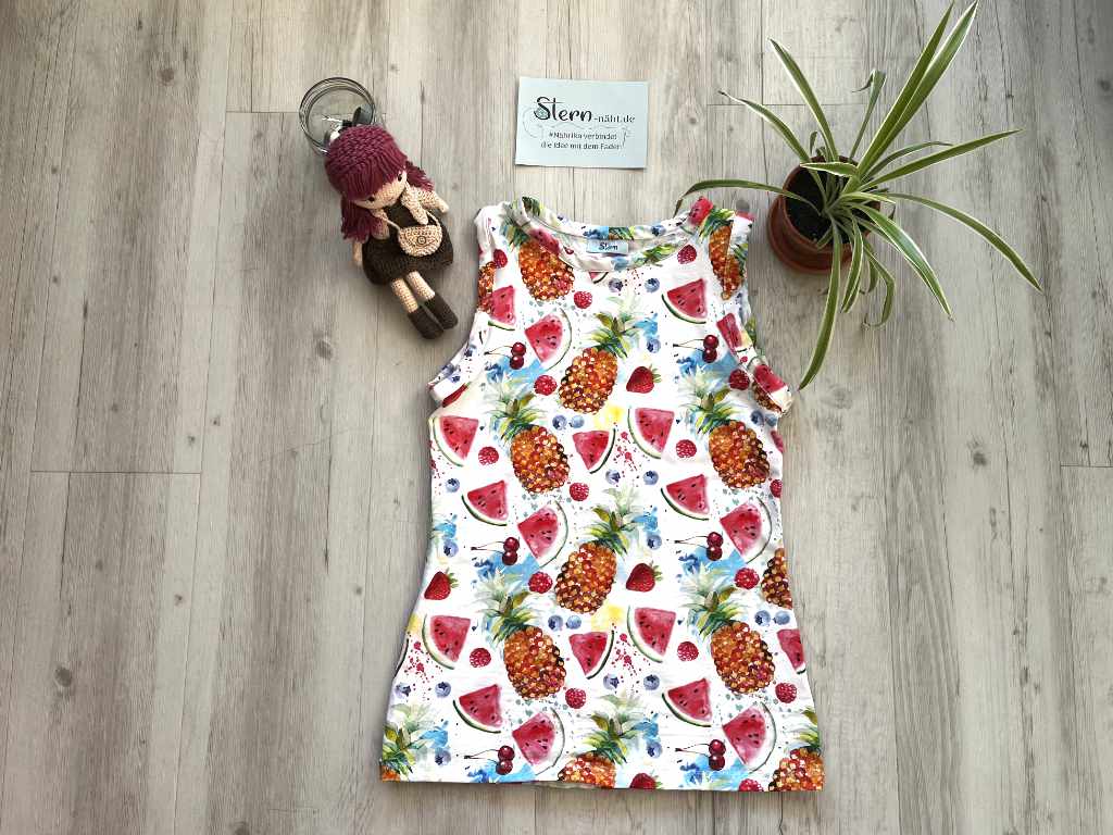 Warum nicht mein neu gekauftes Lieblingstop duplizieren? Das habe ich mich gefragt und aus dem Top den Schnitt abgenommen. Damit ich testen kann, ob das erstellte Schnittmuster auch passt, habe ich zunächst aus diesem sommerlich fruchtigen Jersey-Stoff ein Probeexemplar genäht.
