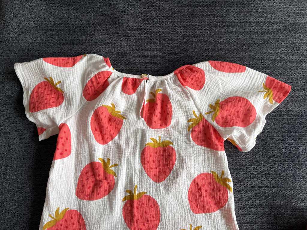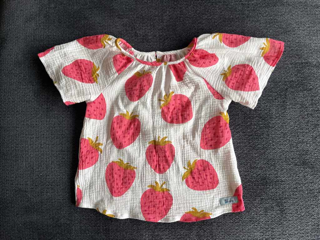 Dieser Musselin-Stoff mit den Erdbeeren liegt schon länger bei mir. Und der ist seit Kauf auch an meine Nichte gedacht. Damals war die Idee noch, ein Sommerkleid daraus zu nähen. Nun ist sie aber schon größer und die Stoffmenge reichte nicht mehr für ein Kleid. Diese luftige Bluse ist eine tolle Alternative.