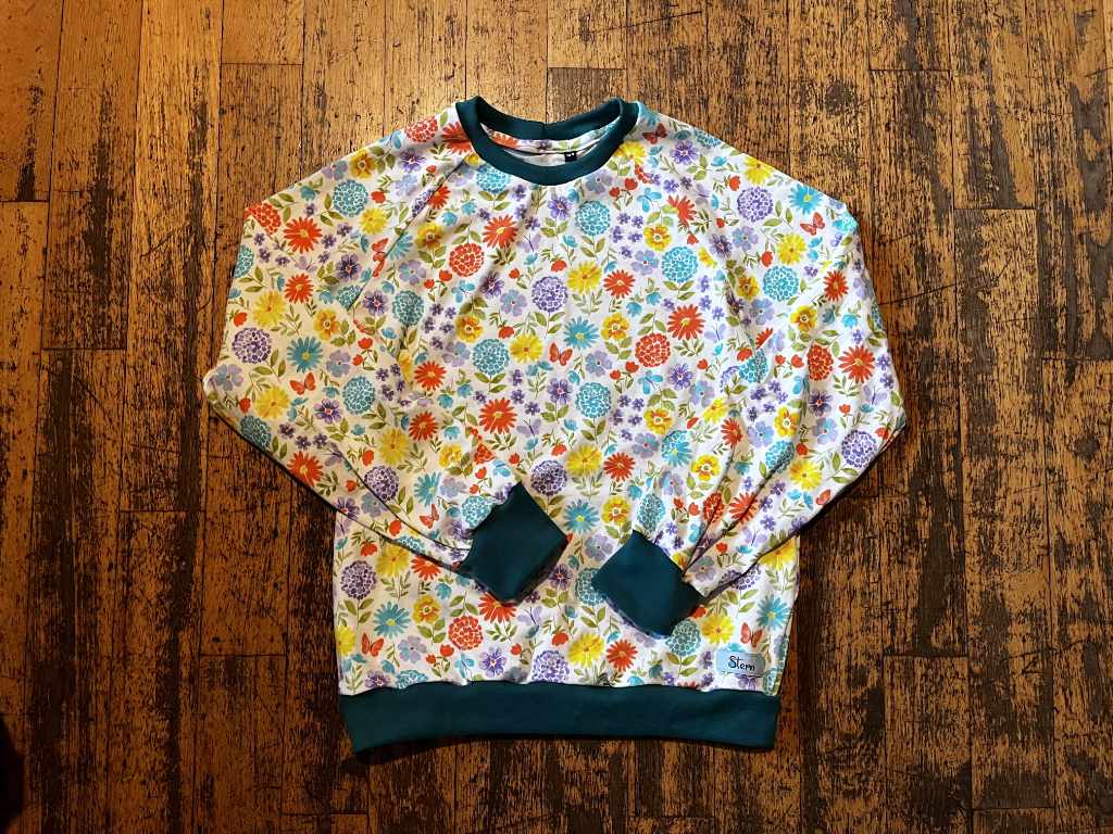 Bunte Blumen zieren diesen Kinderpullover. Mit vielen knalligen Farben wird der Pullover zu einem Hingucker. Die dunklen Bündchen sind bewusst gewählt, damit die nicht gleich schmutzig aussehen.